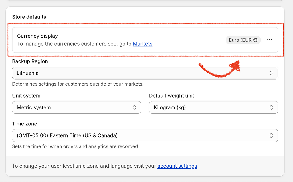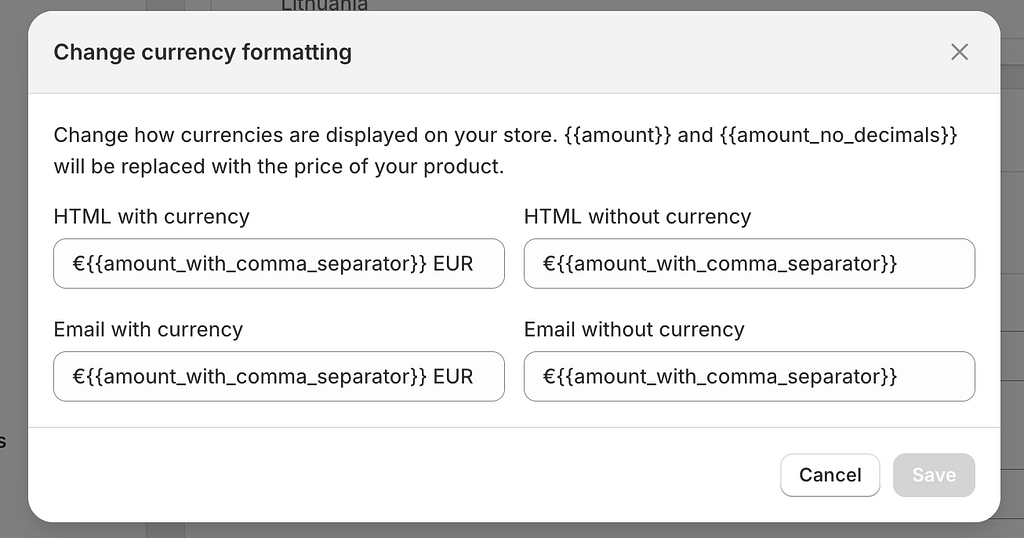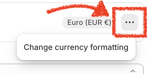 If you need to change how prices are displayed—for example, to move the currency symbol, add or remove decimal places, or change the decimal separator—you can do so directly in your Shopify admin settings.