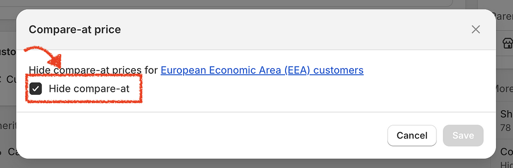 Look for the section related to EU/EEA pricing. You will see a checkbox labeled Hide compare-at prices for European Economic Area (EEA) customers.