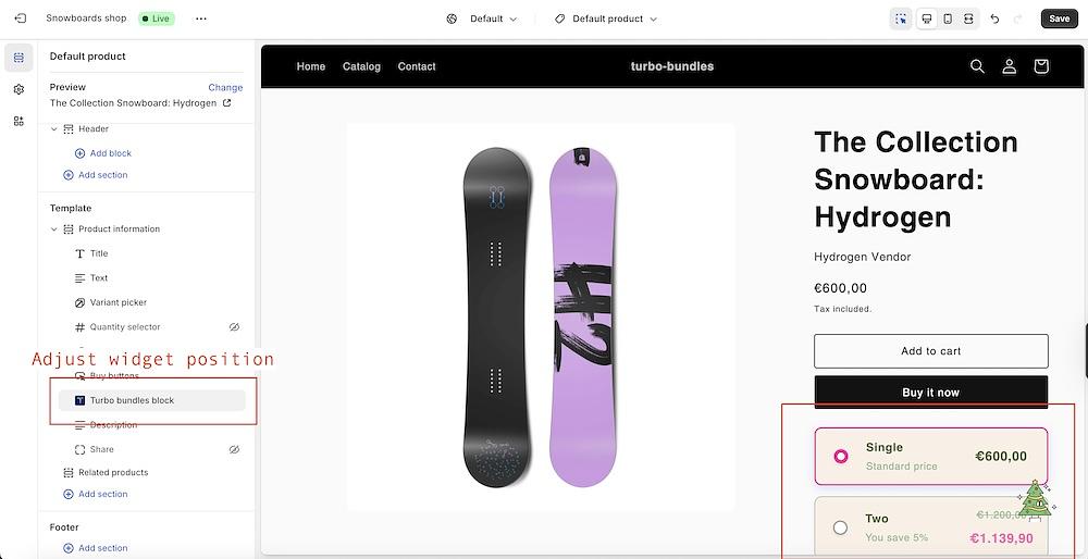 The Turbo Bundles app effortlessly adds its widget to your product pages automatically, requiring no manual setup. However, the widget snippet is flexible and can be placed or embedded in other locations within product details or product information, using app block