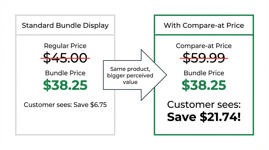 Pricing psychology research consistently shows that anchor pricing—showing a higher reference price next to a lower actual price—significantly increases purchase intent. By anchoring your bundle price against the compare-at price (MSRP), you: