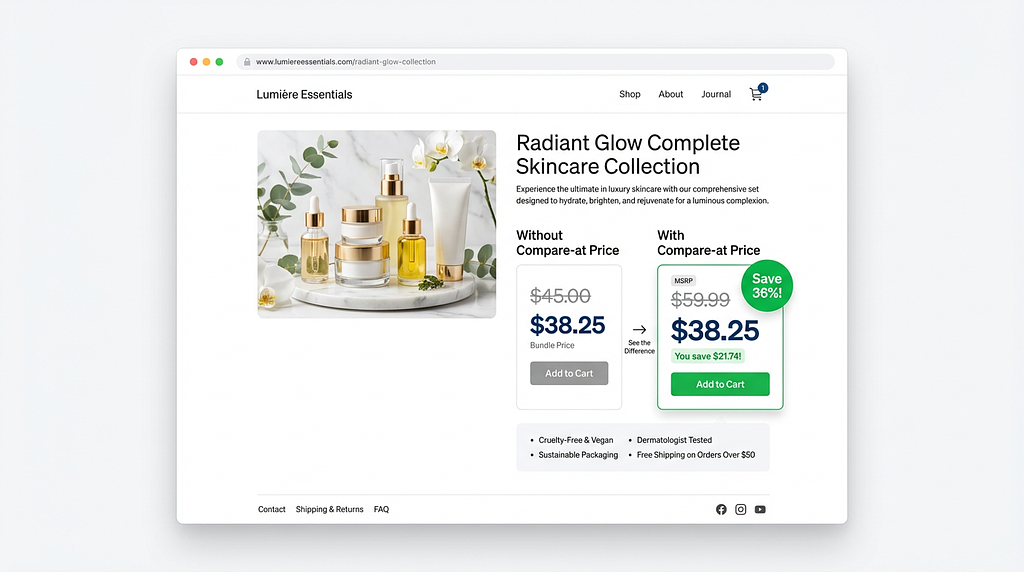 Products with manufacturer's suggested retail prices (MSRP) benefit enormously. A skincare bundle that shows savings from the MSRP communicates premium value while still offering an attractive deal.