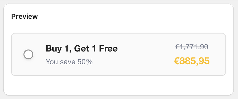 This configuration ensures that when a customer adds two of the selected items to their cart, they will receive a 50% discount on the total price of those two items, effectively making one of them free.
