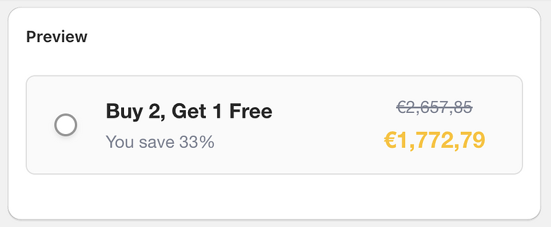 Let's create a "Buy 2, Get 1 Free" offer. Here, the customer gets 3 items in total, with one of them being free.